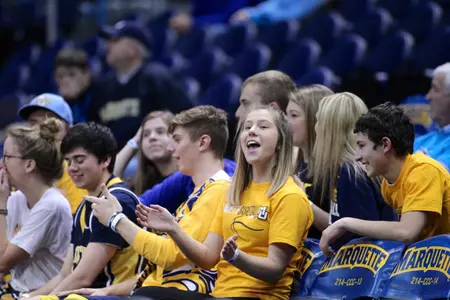 At games earlier this season, the official 2016-17 team poster, a poster celebrating various uniform styles in the 100 years of Marquette basketball and a turquoise t-shirt celebrating Native American Heritage Month were distributed.