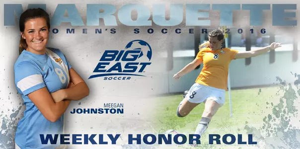 NEW YORK - Marquette University senior Meegan Johnston was named to the BIG EAST Conference Weekly Honor Roll after helping the MU women's soccer team to a 2-0 week with a pair of goals and an assist in wins over Cal Poly and CSUN in the Marquette Invitational.