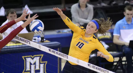 Barber's 13 kills was a career-high and she ended the match with just one error as she hit .571. Senior setter Sara Blasier dished out 28 assists, while classmate Laure Houg collected 17 digs. Marquette (10-3, 0-1) posted just two team blocks in the match on solo blocks from redshirt sophomore Jenna Rosenthal.