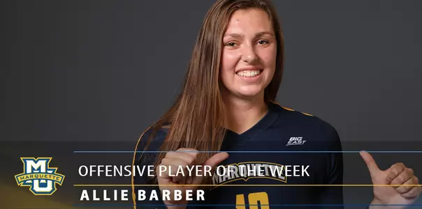 NEW YORK-- Marquette University sophomore Allie Barber has been selected as BIG EAST Offensive Player of the Week for the second straight week and fourth time this season, the league office announced on Tuesday.