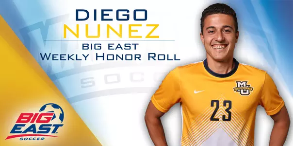 NEW YORK - Marquette University junior Diego NÃÆ'Æ'ºÃÆ'Æ'±ez scored his second goal in three games against No. 14 Georgetown on Saturday and was the second Golden Eagle in as many weeks to be named to the BIG EAST Conference weekly honor roll, the league office announced today.