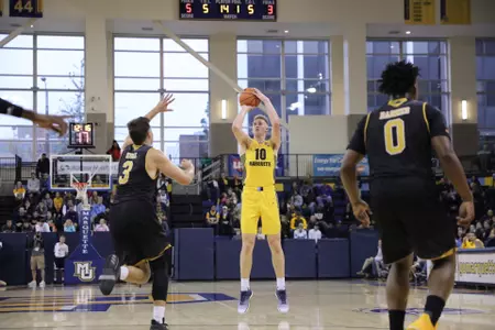 Sophomore Sam Hauser led the way with 27 points and 10 rebounds, including 5-9 from three-point range, followed by redshirt senior Andrew Rowsey with 12 points and 10 assists. Sophomore Markus Howard connected on 3-6 from distance to finish with 13 points.