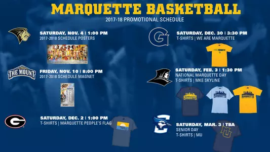 The first t-shirt giveaway will be on Dec. 2 vs. Georgia. There will be a total of four t-shirt giveaways, all distributed to the first 5,000 fans at every Saturday game during the regular season at the BMO Harris Bradley Center. For the 'National Marquette Day' game vs. Providence on Feb. 3, all fans in attendance will receive a limited-edition shirt.