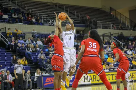 The Golden Eagles (8-5, 2-0 BIG EAST) were led by Allazia Blockton with a season-high 29 points. Erika Davenport poured in 21 points and 11 rebounds for her third double-double this season and Natisha Hiedeman chipped in 14 points to round out double-figure scoring for Marquette.