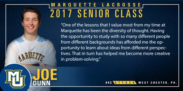 Joe Dunn, a finance major, has become a valuable member of Marquette's offensive unit as a senior and leads the Golden Eagles with a team-high 17 goals through the year's first 12 games. He has scored a career-best four goals twice in 2017 against Georgetown and Duke.