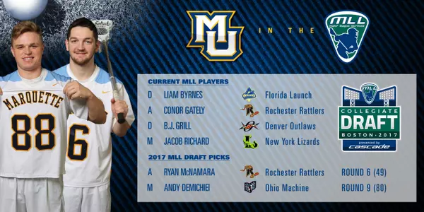 FOXBOROUGH, Massachusetts Â- Former Marquette University men's lacrosse players Ryan McNamara and Andy DeMichiei were each selected on Sunday afternoon in the 2017 MLL Collegiate Draft in Foxborough, Massachusetts. McNamara was selected by the Rochester Rattlers with the 49th overall pick in the sixth round, while DeMichiei went 80th overall to the Ohio Machine with the eighth pick of the ninth round.