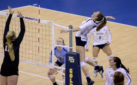 Sophomore Allie Barber led the Golden Eagles (6-5) with 14 kills, while junior Anna Haak matched a career-high 11 kills and had her first double-double in a Marquette uniform with 10 digs. Martha Konovodoff collected 17 digs, while Manon Geoffroy recorded 11.