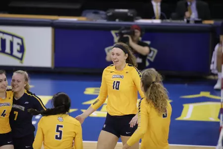 After dropping the first set to the Musketeers (6-10, 1-2), 25-20, Marquette bounced back in the second, overcoming a deficit in the middle and was able to pull a 25-22 victory. The third set was close through the beginning until the Golden Eagles broke a 12-12 tie with a 5-1 run and held an 18-14 lead after Jenna Rosenthal nailed a kill. Werch and Haak helped close out the set with a pair of kills, 25-19.