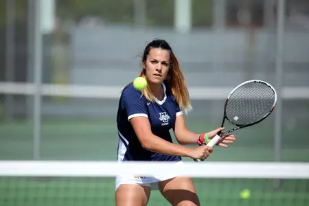 After dropping her first set, 7-6, Andrea Amortegui mounted a comeback to win her last two sets, 6-2 and 10-8. Lesley Foe completed the singles sweep with a 6-4, 6-3 win on the No. 6 court.